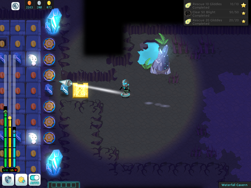 Hello again! It’s Tambika, and I’m giving you a new mission in Waterfall Cavern, just underneath Waterfall Meadow. This cave seems to be where a lot of the blight is coming from, so we need to get in there and destroy the blight inside! Click on blight next to you to clear it. You can click and drag on multiple blight patches to restore them quickly! Blight usually covers treasures and Materials in the Yonders. Go ahead and grab them; you can trade them for cool stuff here at the Academy!